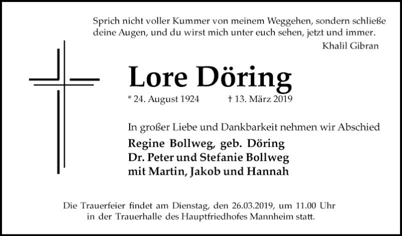 Hier finden Sie alle Traueranzeigen aus der Zeitung, die bisher für Lore Döring erschienen sind. Weitere Traueranzeigen, die in der Zeitung erscheinen, werden hier ebenfalls aufgelistet