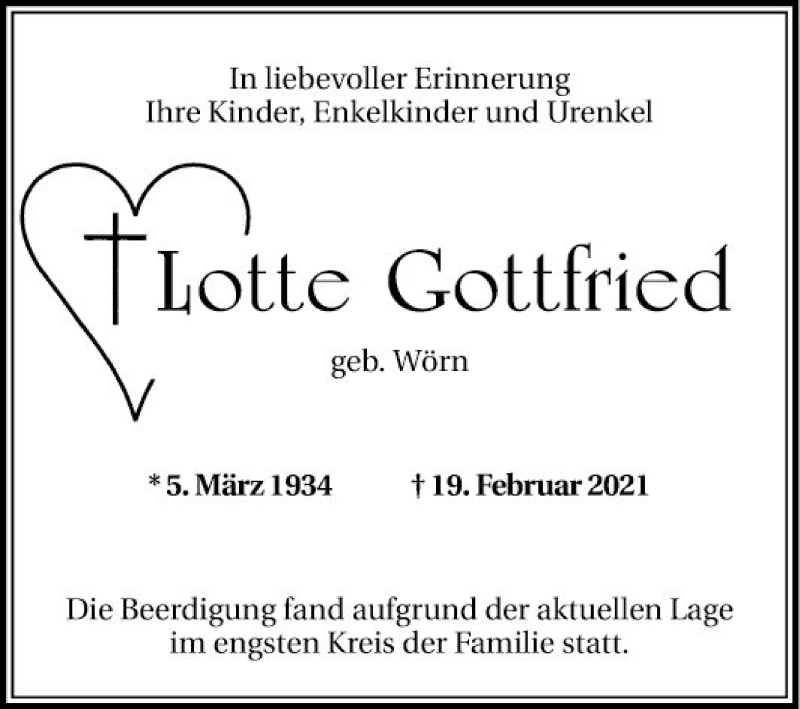 Hier finden Sie alle Traueranzeigen aus der Zeitung, die bisher für Lotte Gottfried erschienen sind. Weitere Traueranzeigen, die in der Zeitung erscheinen, werden hier ebenfalls aufgelistet