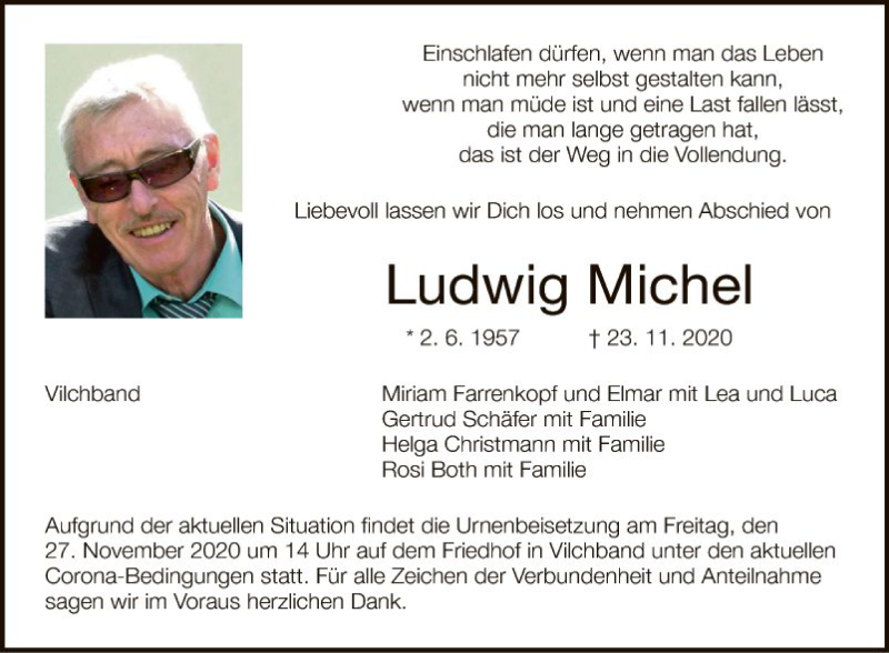 Hier finden Sie alle Traueranzeigen aus der Zeitung, die bisher für Ludwig Michel erschienen sind. Weitere Traueranzeigen, die in der Zeitung erscheinen, werden hier ebenfalls aufgelistet