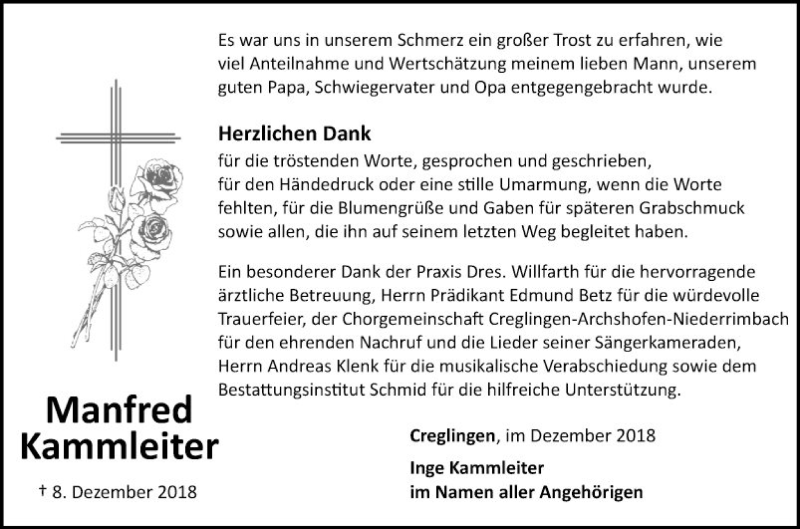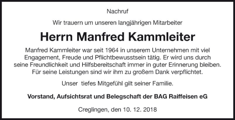 Hier finden Sie alle Traueranzeigen aus der Zeitung, die bisher für Manfred Kammleiter erschienen sind. Weitere Traueranzeigen, die in der Zeitung erscheinen, werden hier ebenfalls aufgelistet