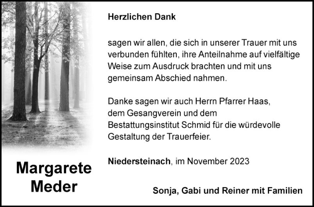 Hier finden Sie alle Traueranzeigen aus der Zeitung, die bisher für Margarete Meder erschienen sind. Weitere Traueranzeigen, die in der Zeitung erscheinen, werden hier ebenfalls aufgelistet