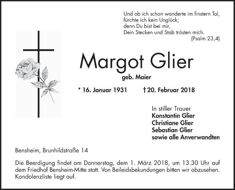 Hier finden Sie alle Traueranzeigen aus der Zeitung, die bisher für Margot Glier erschienen sind. Weitere Traueranzeigen, die in der Zeitung erscheinen, werden hier ebenfalls aufgelistet