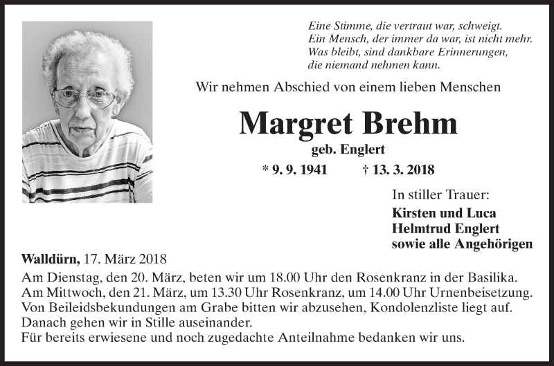 Hier finden Sie alle Traueranzeigen aus der Zeitung, die bisher für Margret Brehm erschienen sind. Weitere Traueranzeigen, die in der Zeitung erscheinen, werden hier ebenfalls aufgelistet