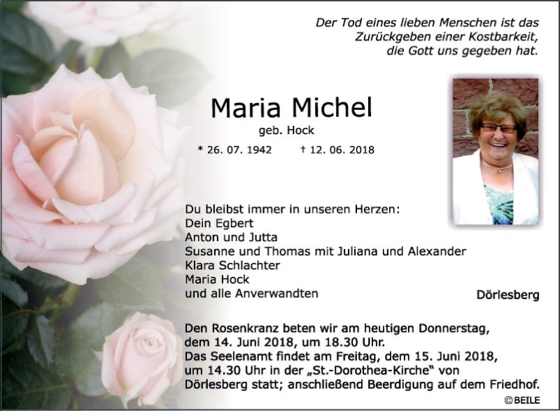Hier finden Sie alle Traueranzeigen aus der Zeitung, die bisher für Maria Michel erschienen sind. Weitere Traueranzeigen, die in der Zeitung erscheinen, werden hier ebenfalls aufgelistet