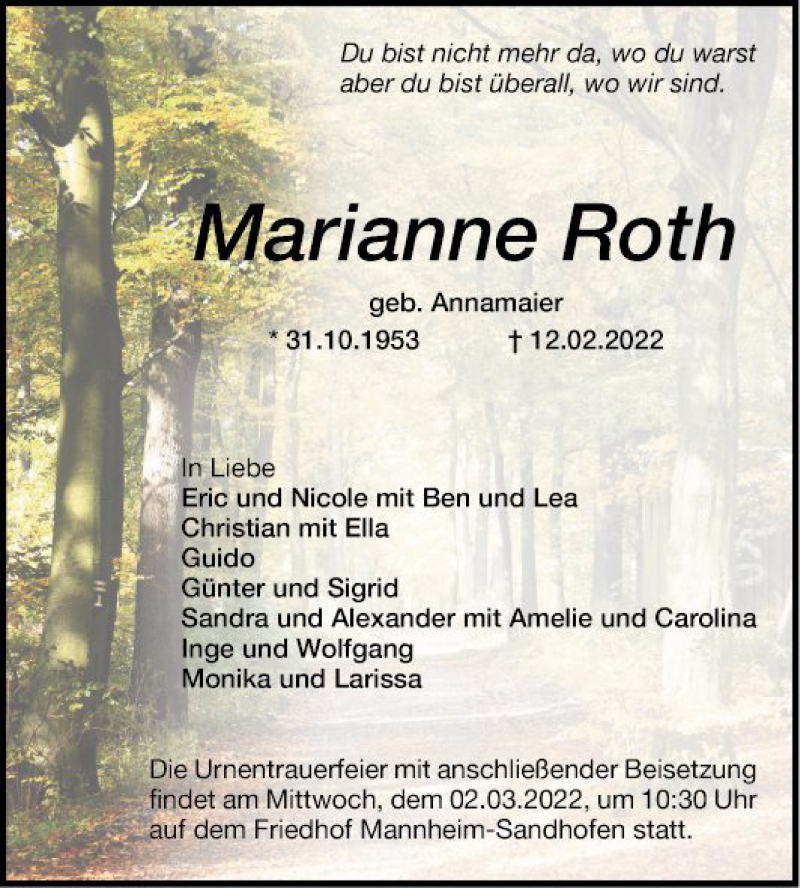 Hier finden Sie alle Traueranzeigen aus der Zeitung, die bisher für Marianne Roth erschienen sind. Weitere Traueranzeigen, die in der Zeitung erscheinen, werden hier ebenfalls aufgelistet