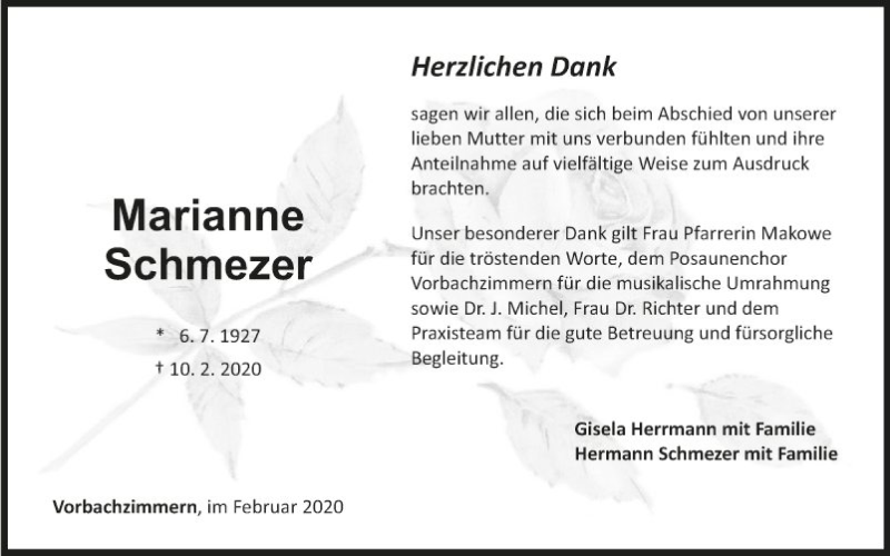 Hier finden Sie alle Traueranzeigen aus der Zeitung, die bisher für Marianne Schmezer erschienen sind. Weitere Traueranzeigen, die in der Zeitung erscheinen, werden hier ebenfalls aufgelistet
