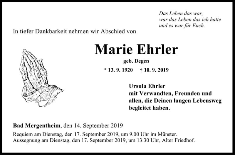 Hier finden Sie alle Traueranzeigen aus der Zeitung, die bisher für Marie Ehrler erschienen sind. Weitere Traueranzeigen, die in der Zeitung erscheinen, werden hier ebenfalls aufgelistet