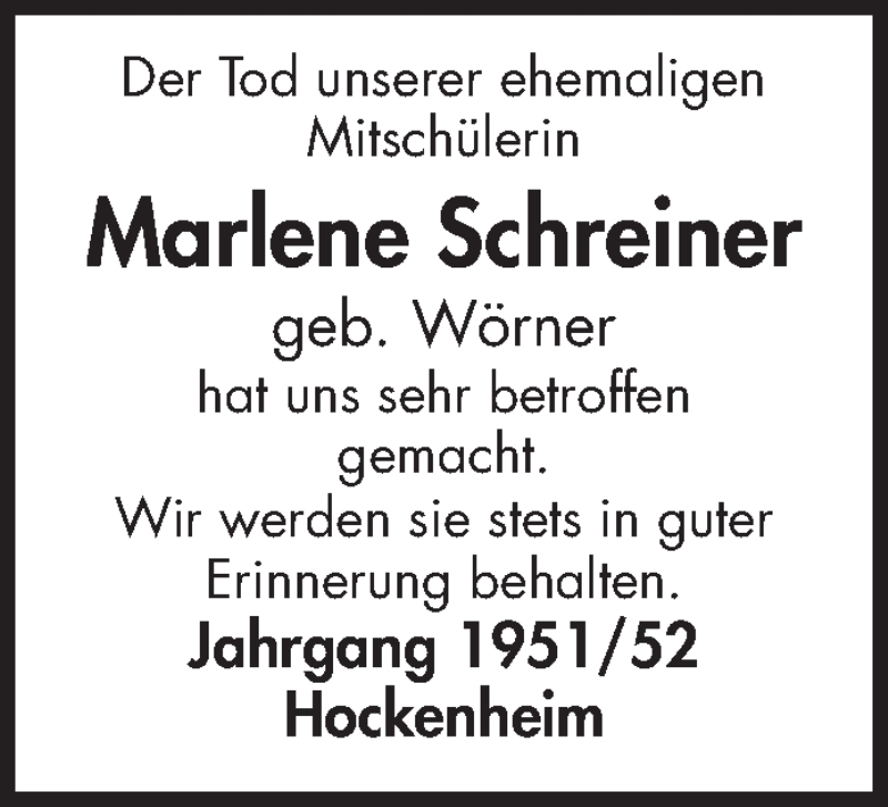 Hier finden Sie alle Traueranzeigen aus der Zeitung, die bisher für Marlene Schreiner erschienen sind. Weitere Traueranzeigen, die in der Zeitung erscheinen, werden hier ebenfalls aufgelistet