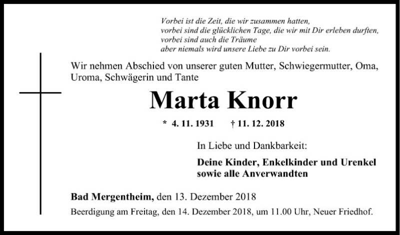 Hier finden Sie alle Traueranzeigen aus der Zeitung, die bisher für Marta Knorr erschienen sind. Weitere Traueranzeigen, die in der Zeitung erscheinen, werden hier ebenfalls aufgelistet