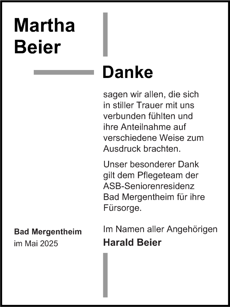 Hier finden Sie alle Traueranzeigen aus der Zeitung, die bisher für Martha Beier erschienen sind. Weitere Traueranzeigen, die in der Zeitung erscheinen, werden hier ebenfalls aufgelistet
