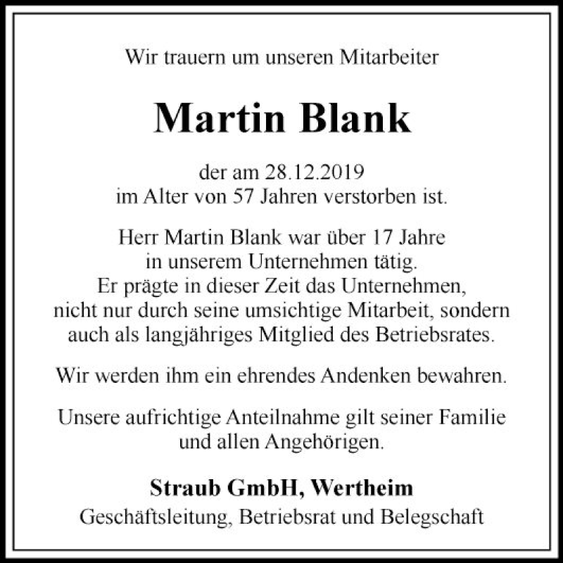 Hier finden Sie alle Traueranzeigen aus der Zeitung, die bisher für Martin Blank erschienen sind. Weitere Traueranzeigen, die in der Zeitung erscheinen, werden hier ebenfalls aufgelistet