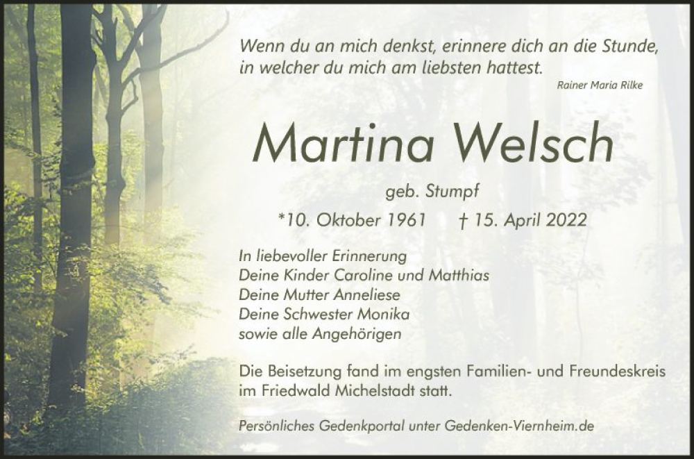Hier finden Sie alle Traueranzeigen aus der Zeitung, die bisher für Martina Welsch erschienen sind. Weitere Traueranzeigen, die in der Zeitung erscheinen, werden hier ebenfalls aufgelistet