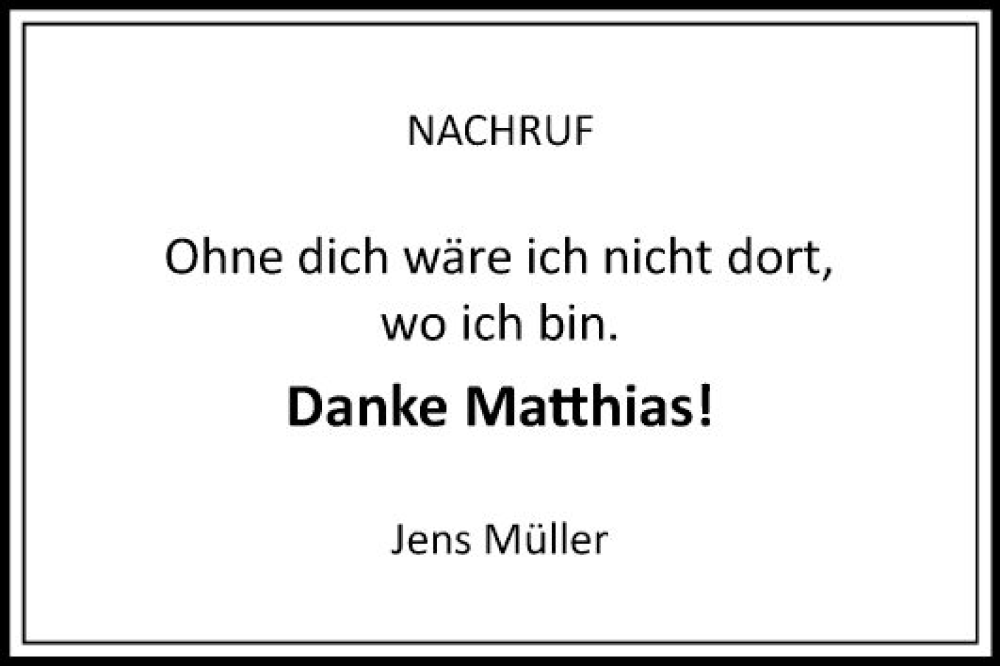 Hier finden Sie alle Traueranzeigen aus der Zeitung, die bisher für Matthias erschienen sind. Weitere Traueranzeigen, die in der Zeitung erscheinen, werden hier ebenfalls aufgelistet