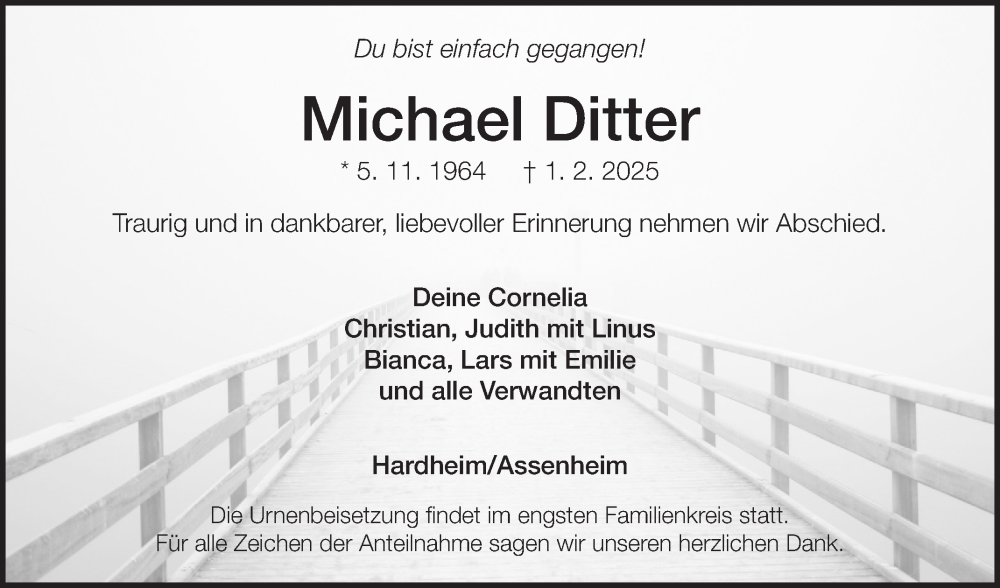 Hier finden Sie alle Traueranzeigen aus der Zeitung, die bisher für Michael Ditter erschienen sind. Weitere Traueranzeigen, die in der Zeitung erscheinen, werden hier ebenfalls aufgelistet