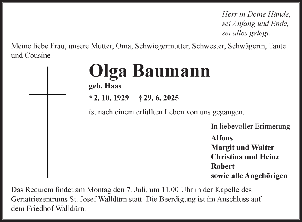 Hier finden Sie alle Traueranzeigen aus der Zeitung, die bisher für Olga Baumann erschienen sind. Weitere Traueranzeigen, die in der Zeitung erscheinen, werden hier ebenfalls aufgelistet