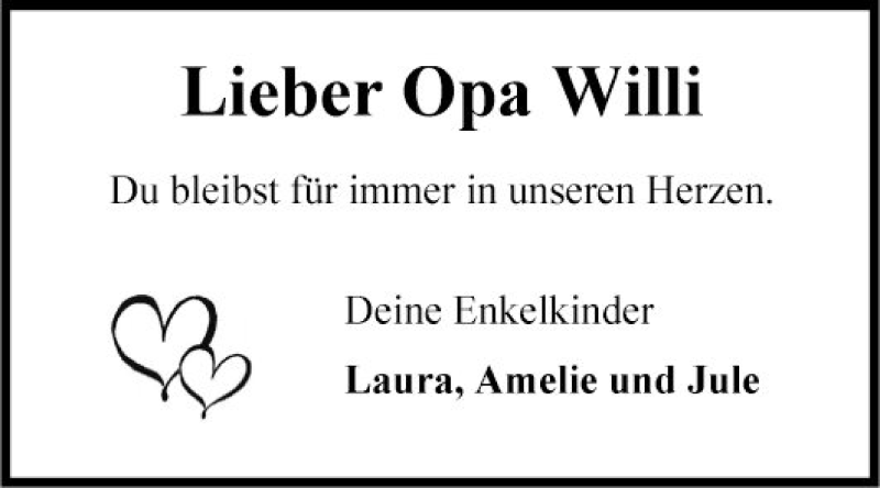 Hier finden Sie alle Traueranzeigen aus der Zeitung, die bisher für Opa Willi erschienen sind. Weitere Traueranzeigen, die in der Zeitung erscheinen, werden hier ebenfalls aufgelistet