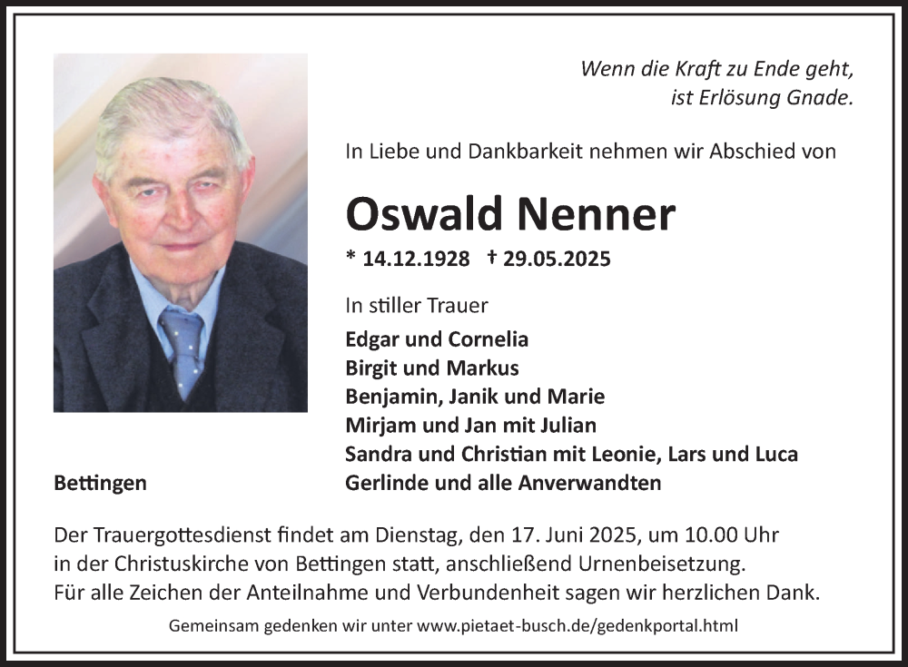 Hier finden Sie alle Traueranzeigen aus der Zeitung, die bisher für Oswald Nenner erschienen sind. Weitere Traueranzeigen, die in der Zeitung erscheinen, werden hier ebenfalls aufgelistet