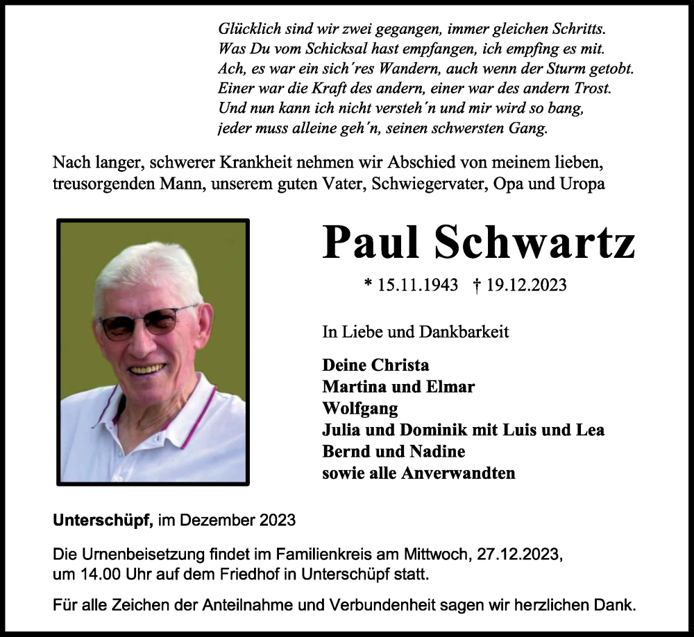 Hier finden Sie alle Traueranzeigen aus der Zeitung, die bisher für Paul Schwartz erschienen sind. Weitere Traueranzeigen, die in der Zeitung erscheinen, werden hier ebenfalls aufgelistet