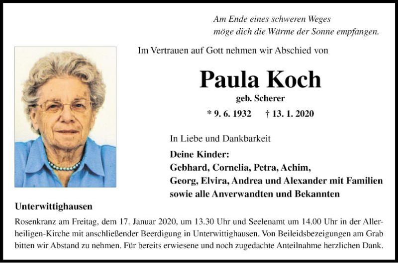 Hier finden Sie alle Traueranzeigen aus der Zeitung, die bisher für Paula Koch erschienen sind. Weitere Traueranzeigen, die in der Zeitung erscheinen, werden hier ebenfalls aufgelistet