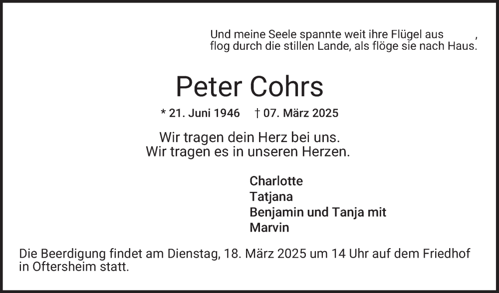 Hier finden Sie alle Traueranzeigen aus der Zeitung, die bisher für Peter Cohrs erschienen sind. Weitere Traueranzeigen, die in der Zeitung erscheinen, werden hier ebenfalls aufgelistet