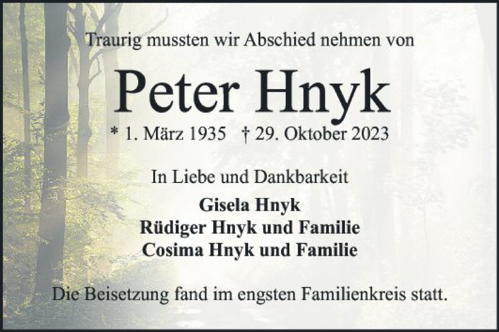 Hier finden Sie alle Traueranzeigen aus der Zeitung, die bisher für Peter Hnyk erschienen sind. Weitere Traueranzeigen, die in der Zeitung erscheinen, werden hier ebenfalls aufgelistet