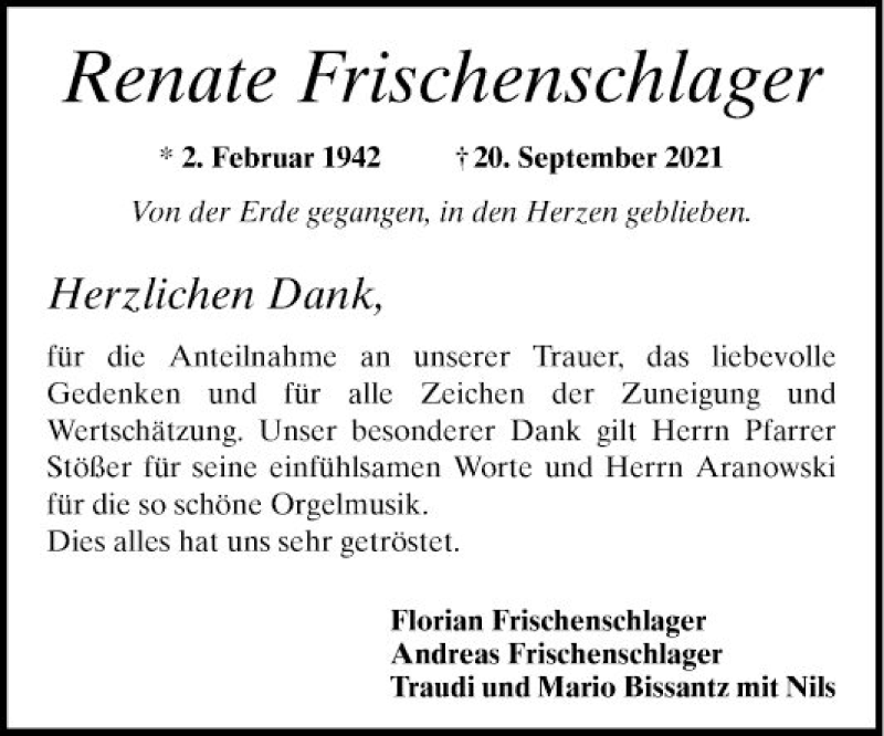 Hier finden Sie alle Traueranzeigen aus der Zeitung, die bisher für Renate Frischenschlager erschienen sind. Weitere Traueranzeigen, die in der Zeitung erscheinen, werden hier ebenfalls aufgelistet