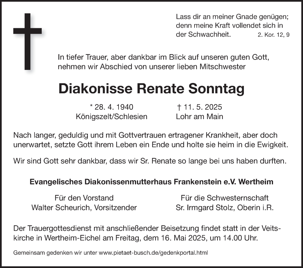 Hier finden Sie alle Traueranzeigen aus der Zeitung, die bisher für Renate Sonntag erschienen sind. Weitere Traueranzeigen, die in der Zeitung erscheinen, werden hier ebenfalls aufgelistet