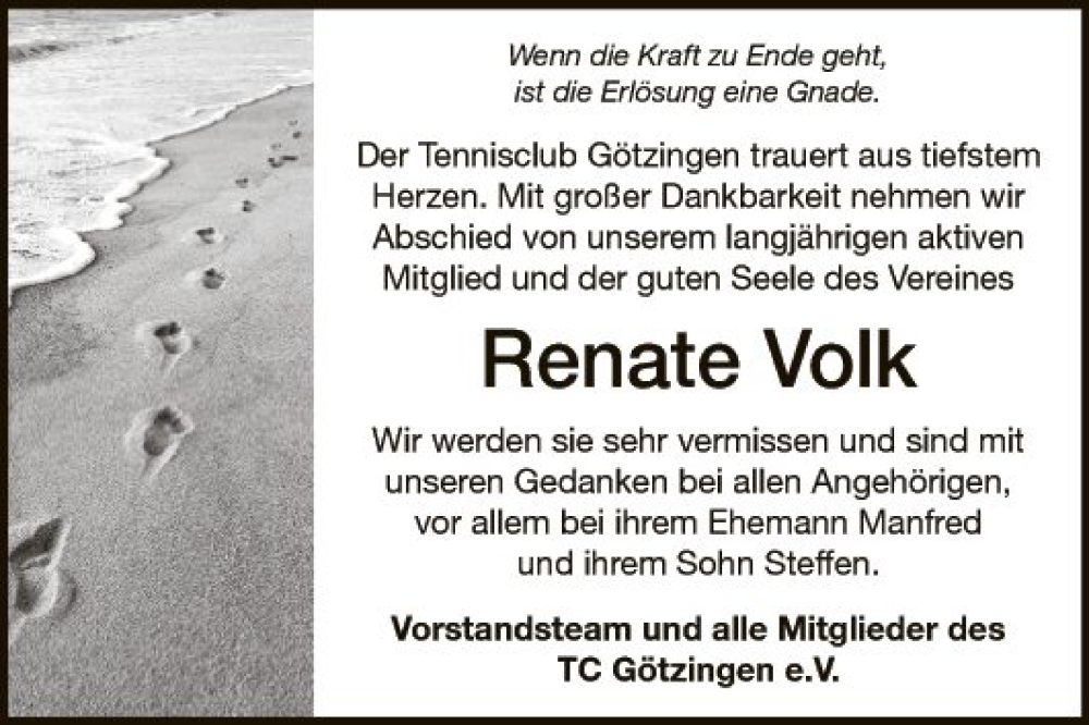 Hier finden Sie alle Traueranzeigen aus der Zeitung, die bisher für Renate Volk erschienen sind. Weitere Traueranzeigen, die in der Zeitung erscheinen, werden hier ebenfalls aufgelistet