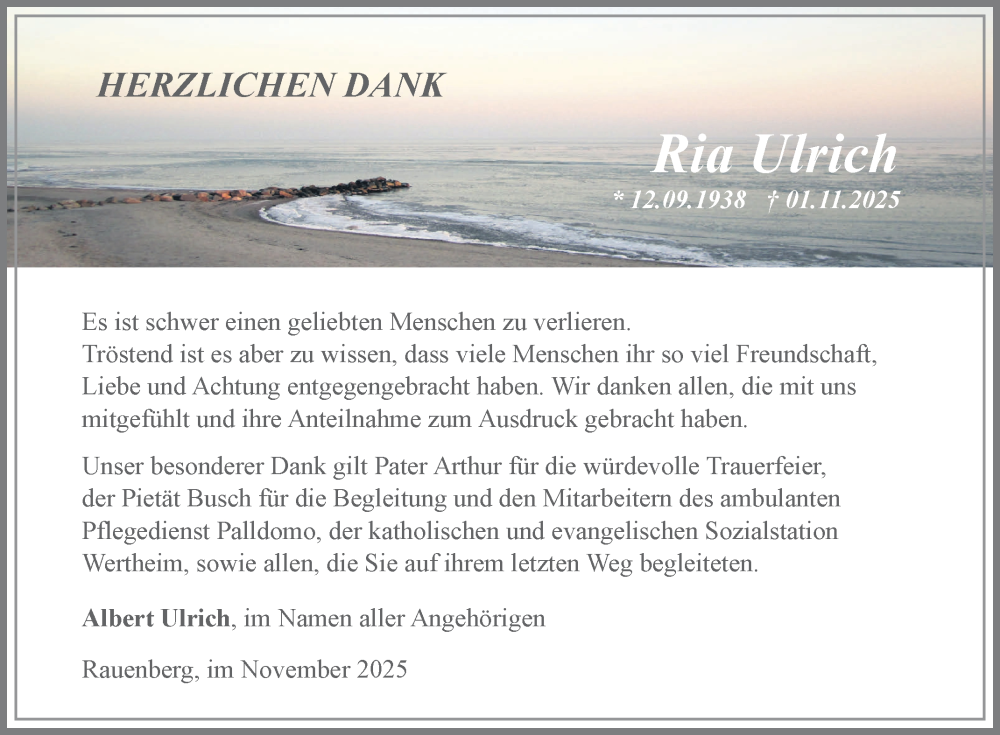 Hier finden Sie alle Traueranzeigen aus der Zeitung, die bisher für Ria Ulrich erschienen sind. Weitere Traueranzeigen, die in der Zeitung erscheinen, werden hier ebenfalls aufgelistet