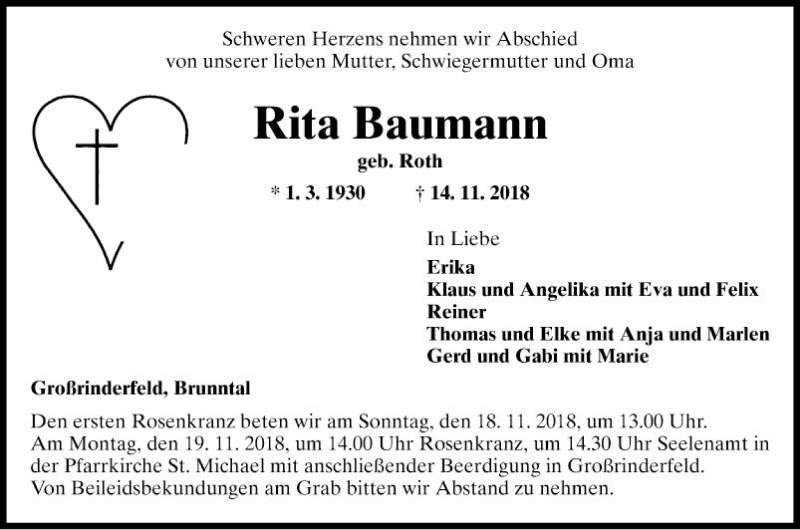 Hier finden Sie alle Traueranzeigen aus der Zeitung, die bisher für Rita Baumann erschienen sind. Weitere Traueranzeigen, die in der Zeitung erscheinen, werden hier ebenfalls aufgelistet