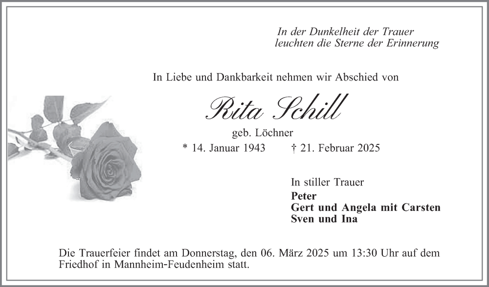 Hier finden Sie alle Traueranzeigen aus der Zeitung, die bisher für Rita Schill erschienen sind. Weitere Traueranzeigen, die in der Zeitung erscheinen, werden hier ebenfalls aufgelistet