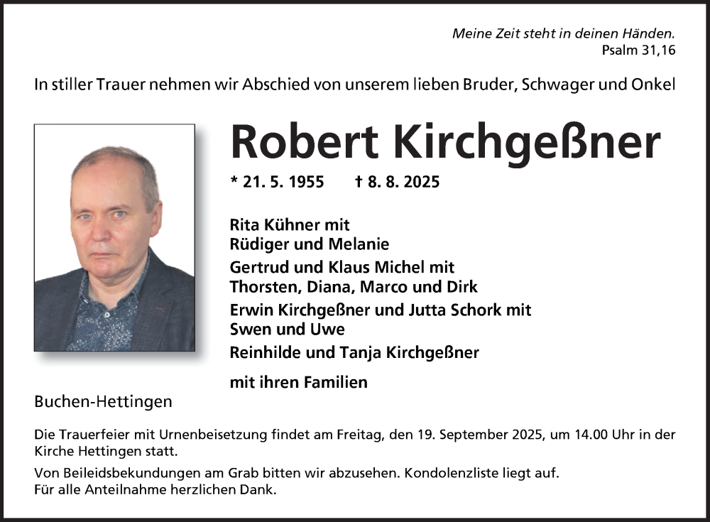 Hier finden Sie alle Traueranzeigen aus der Zeitung, die bisher für Robert Kirchgeßner erschienen sind. Weitere Traueranzeigen, die in der Zeitung erscheinen, werden hier ebenfalls aufgelistet