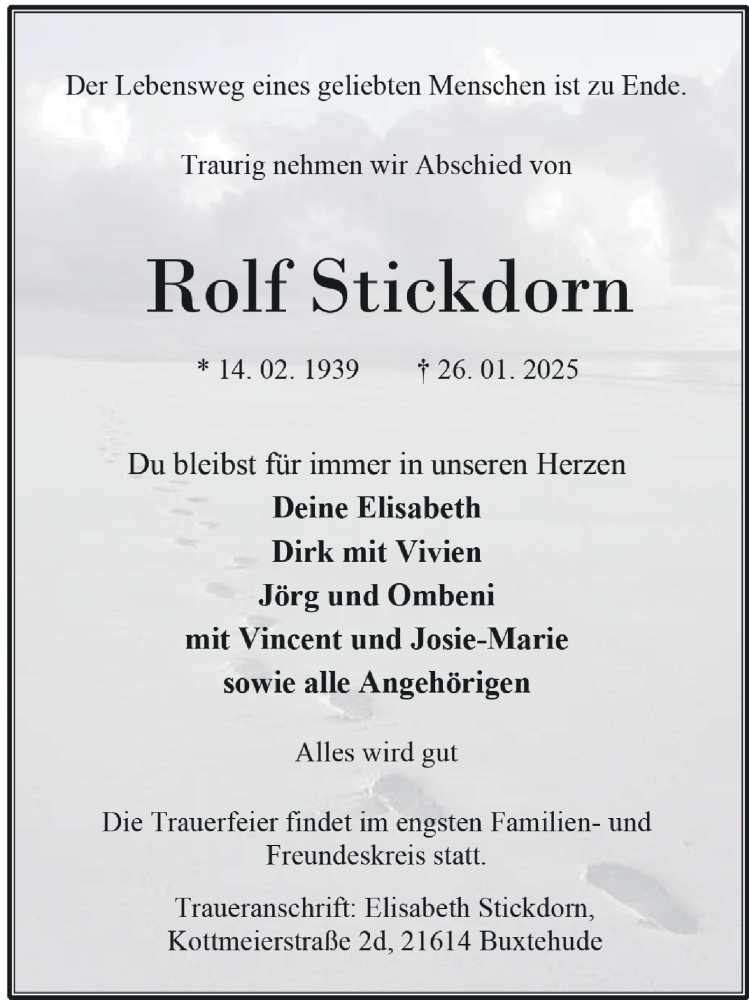 Hier finden Sie alle Traueranzeigen aus der Zeitung, die bisher für Rolf Stickdorn erschienen sind. Weitere Traueranzeigen, die in der Zeitung erscheinen, werden hier ebenfalls aufgelistet