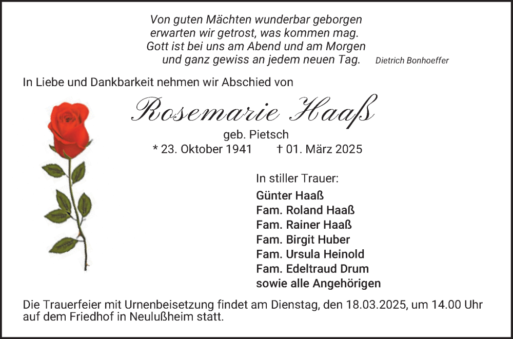 Hier finden Sie alle Traueranzeigen aus der Zeitung, die bisher für Rosemarie Haaß erschienen sind. Weitere Traueranzeigen, die in der Zeitung erscheinen, werden hier ebenfalls aufgelistet