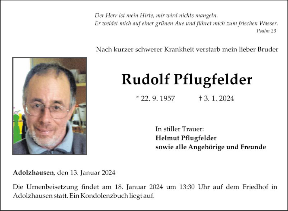 Hier finden Sie alle Traueranzeigen aus der Zeitung, die bisher für Rudolf Pflugfelder erschienen sind. Weitere Traueranzeigen, die in der Zeitung erscheinen, werden hier ebenfalls aufgelistet