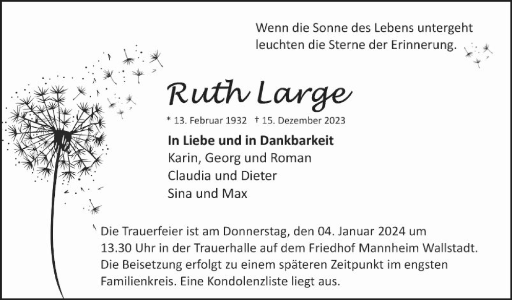 Hier finden Sie alle Traueranzeigen aus der Zeitung, die bisher für Ruth Large erschienen sind. Weitere Traueranzeigen, die in der Zeitung erscheinen, werden hier ebenfalls aufgelistet