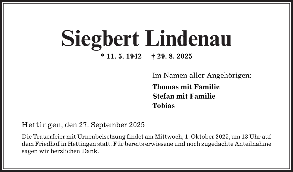 Hier finden Sie alle Traueranzeigen aus der Zeitung, die bisher für Siegbert Lindenau erschienen sind. Weitere Traueranzeigen, die in der Zeitung erscheinen, werden hier ebenfalls aufgelistet