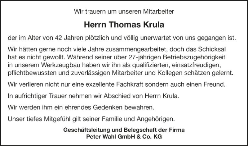 Hier finden Sie alle Traueranzeigen aus der Zeitung, die bisher für Thomas Krula erschienen sind. Weitere Traueranzeigen, die in der Zeitung erscheinen, werden hier ebenfalls aufgelistet