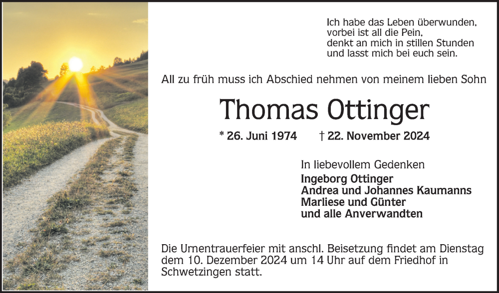 Hier finden Sie alle Traueranzeigen aus der Zeitung, die bisher für Thomas Ottinger erschienen sind. Weitere Traueranzeigen, die in der Zeitung erscheinen, werden hier ebenfalls aufgelistet