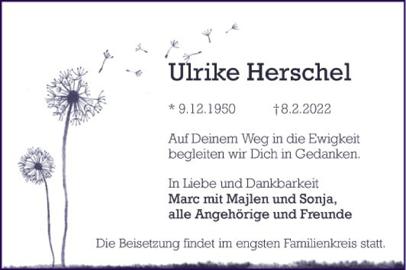 Hier finden Sie alle Traueranzeigen aus der Zeitung, die bisher für Ulrike Herschel erschienen sind. Weitere Traueranzeigen, die in der Zeitung erscheinen, werden hier ebenfalls aufgelistet