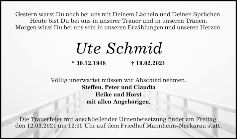 Hier finden Sie alle Traueranzeigen aus der Zeitung, die bisher für Ute Schmid erschienen sind. Weitere Traueranzeigen, die in der Zeitung erscheinen, werden hier ebenfalls aufgelistet