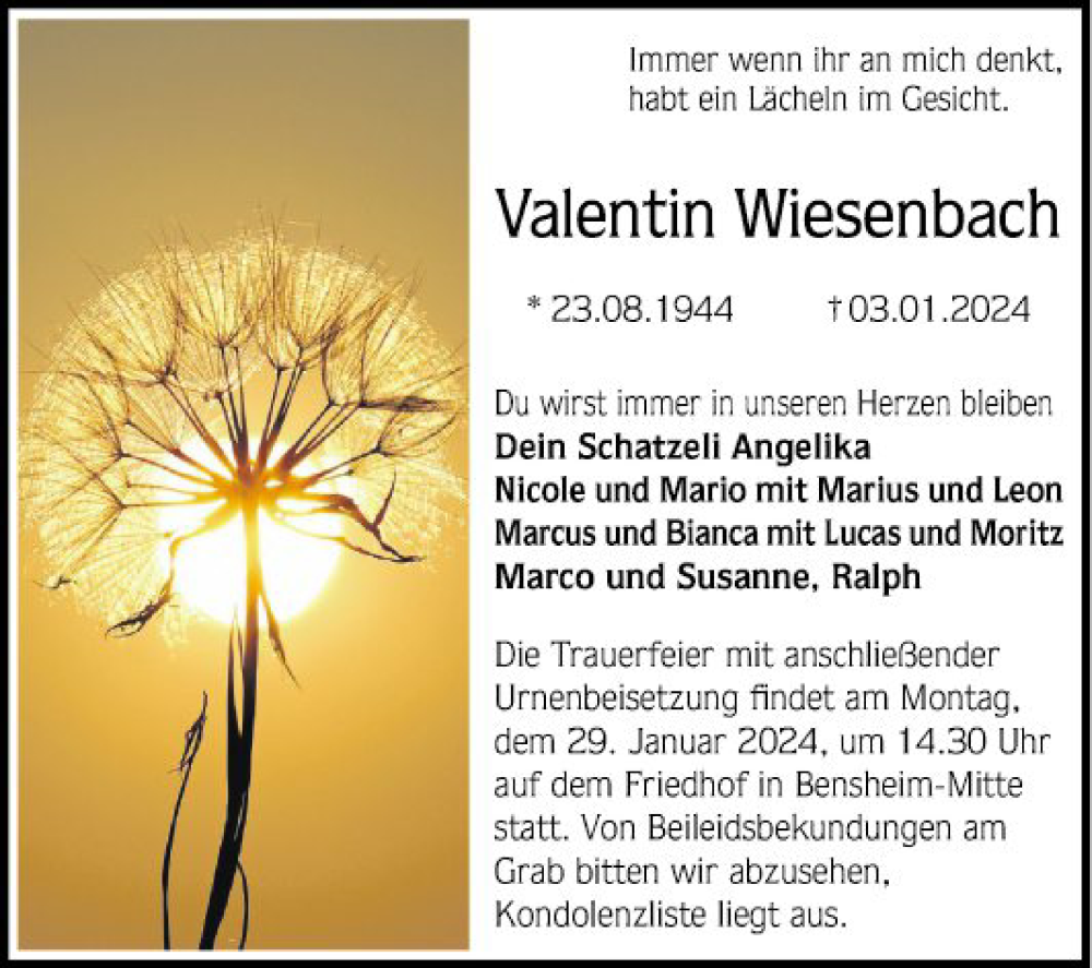 Hier finden Sie alle Traueranzeigen aus der Zeitung, die bisher für Valentin Wiesenbach erschienen sind. Weitere Traueranzeigen, die in der Zeitung erscheinen, werden hier ebenfalls aufgelistet