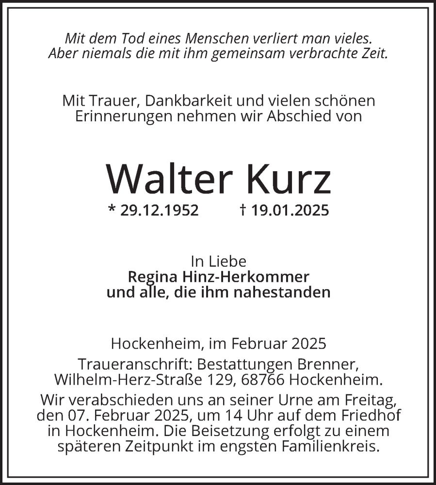 Hier finden Sie alle Traueranzeigen aus der Zeitung, die bisher für Walter Kurz erschienen sind. Weitere Traueranzeigen, die in der Zeitung erscheinen, werden hier ebenfalls aufgelistet