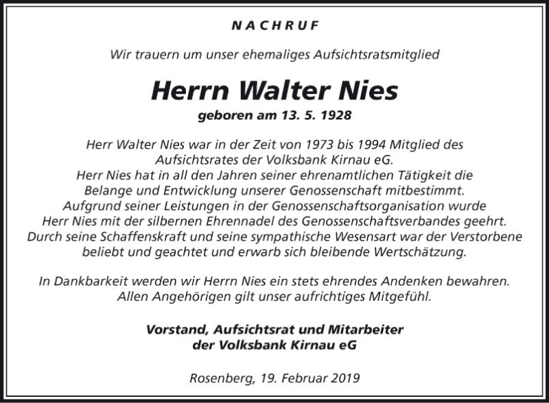 Hier finden Sie alle Traueranzeigen aus der Zeitung, die bisher für Walter Nies erschienen sind. Weitere Traueranzeigen, die in der Zeitung erscheinen, werden hier ebenfalls aufgelistet
