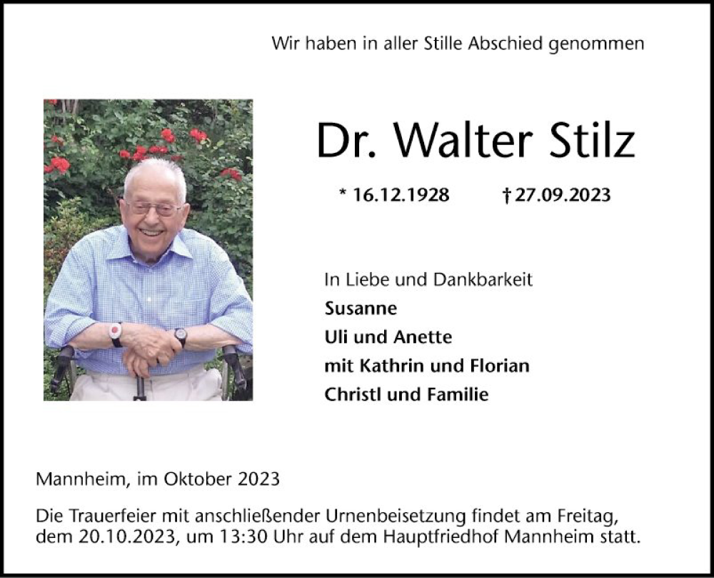 Hier finden Sie alle Traueranzeigen aus der Zeitung, die bisher für Walter Stilz erschienen sind. Weitere Traueranzeigen, die in der Zeitung erscheinen, werden hier ebenfalls aufgelistet