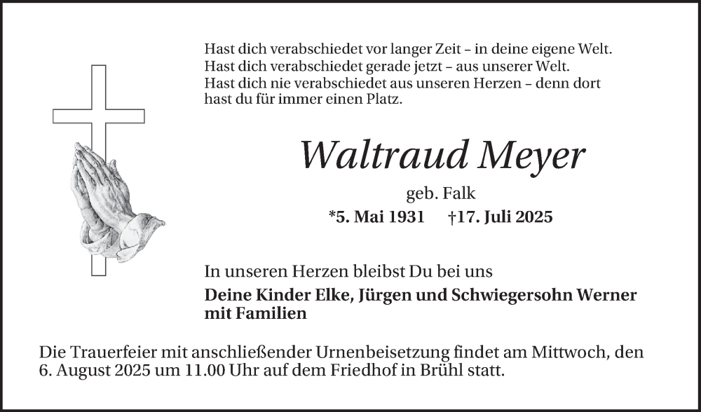 Hier finden Sie alle Traueranzeigen aus der Zeitung, die bisher für Waltraud Meyer erschienen sind. Weitere Traueranzeigen, die in der Zeitung erscheinen, werden hier ebenfalls aufgelistet