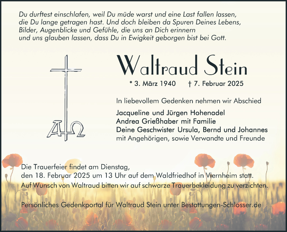 Hier finden Sie alle Traueranzeigen aus der Zeitung, die bisher für Waltraud Stein erschienen sind. Weitere Traueranzeigen, die in der Zeitung erscheinen, werden hier ebenfalls aufgelistet
