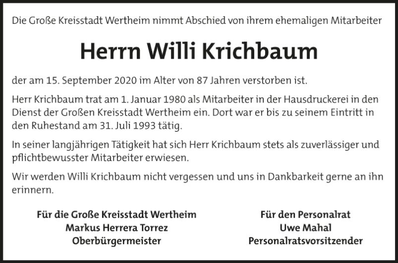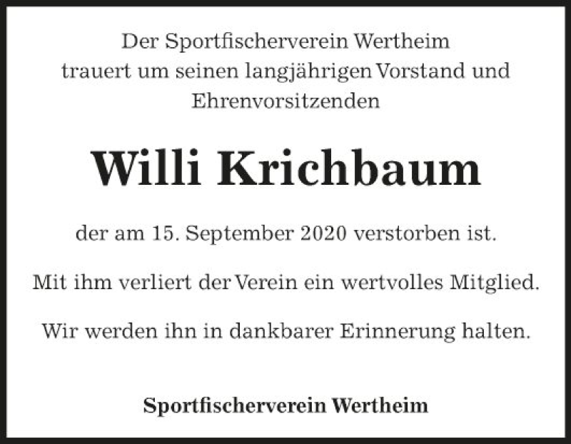 Hier finden Sie alle Traueranzeigen aus der Zeitung, die bisher für Willi Krichbaum erschienen sind. Weitere Traueranzeigen, die in der Zeitung erscheinen, werden hier ebenfalls aufgelistet