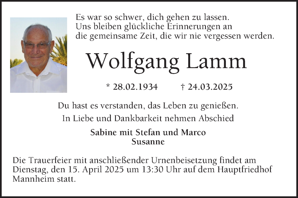 Hier finden Sie alle Traueranzeigen aus der Zeitung, die bisher für Wolfgang Lamm erschienen sind. Weitere Traueranzeigen, die in der Zeitung erscheinen, werden hier ebenfalls aufgelistet